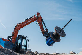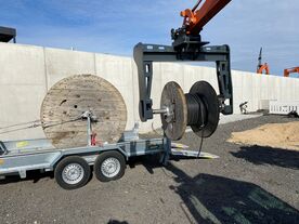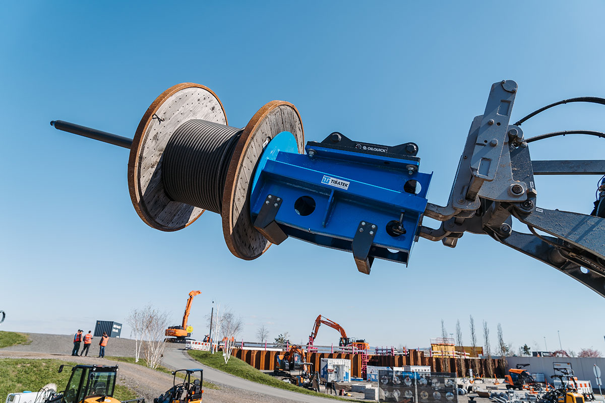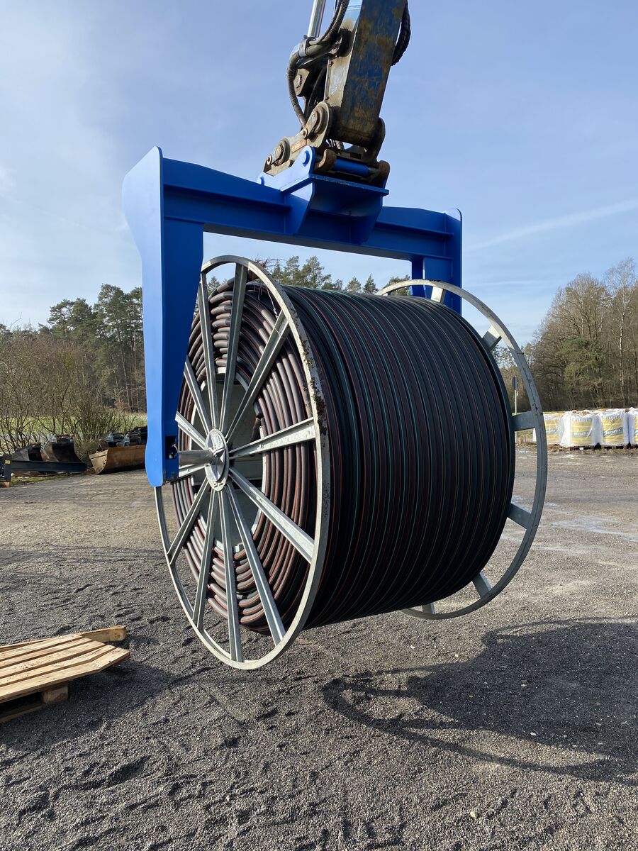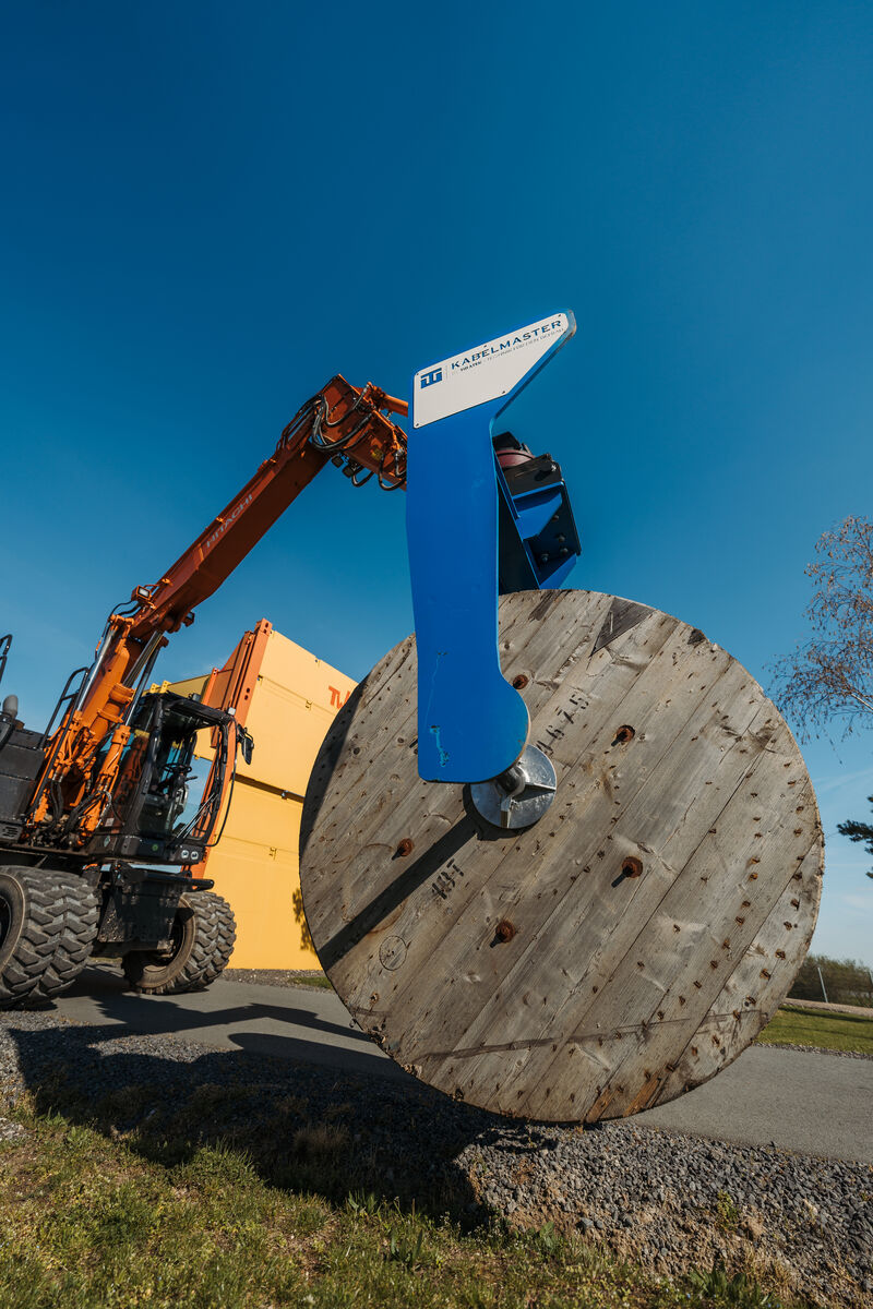 Der TIBATEK Kabeldorn dient zum Transport von Kabelrollen. Neben der nahezu universellen Eignung für Bagger ab 5 t kann er dank seiner integrierten Staplertaschen zusätzlich auch mit dem Radlader sowie Gabelstapler aufgenommen werden. In Kombination mit einem Rotator oder Tiltrotator ist der Kabeldorn auch ideal zum verlegen von Kabeln geeignet. Der Kabelmaster ist ein praktisches Anbauwerkzeug, das die Verlegung von Kabeln und Rohrleitungen erleichtert. Mit einem an einen Bagger angebrachten KM 3000 lassen sich bis zu 5 Tonnen schwere Kabel- und Rohrtrommeln mit nur einem Mitarbeiter bewegen und abrollen. Die kleinere KMR 2000-Version mit einer Maximalbelastung von 3 Tonnen ist sowohl an Bagger als auch an Radlader anbaubar. So wird die Handhabung verschieden großer Trommeln vor allem sicher und einfach.
