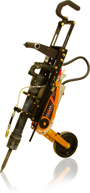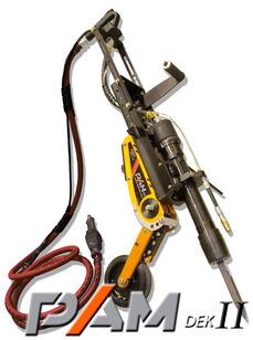 The PAM DEK is a personal support for all your work stitching or flaking, this ingenious spring system with a self-locking wheel, uses, amplifies and redirects the weight of the operator while absorbing the vibrations of the hammer. The working posture and the effort to produce decreases fatigue and thus increases productivity. Equipped with a water spray dust management system upon activation of the hammer, fully pneumatic, handy and with very little maintenance, The PAM DEK is simply indispensable.