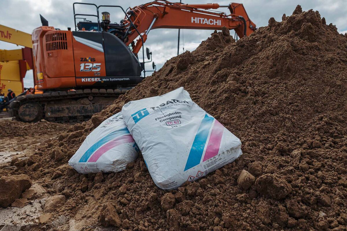 De TIBATEK bak voor vloeibare grond is sinds 2015 de eenvoudigste en meest flexibele manier om vloeibare grond ZFSV* te produceren. Hiervoor wordt de uitgegraven grond of het gerecyclede materiaal direct op de bouwplaats gemengd met een compound/poeder en water tot vloeibare grond. De bak voor vloeibare grond is verkrijgbaar in drie maten. Hij kan worden gebruikt op een graafmachine vanaf 16 ton. *ZFSV: Tijdelijk vloeibaar, zelfverdichtend opvulmateriaal, later weer uitschepbaar. Ideaal voor het opvullen van putten met daarin kabels en/of leidingen of moeilijk toegankelijke putten. De milieuvriendelijke TIBATEK-vloeibare grond compound biedt betrouwbare bescherming tegen het instorten en verschuiven van de vloer dankzij de hoge belastbaarheid. Onze compound is verkrijgbaar in verschillende samenstellingen en is daarom geoptimaliseerd voor de respectieve bodemomstandigheden. Instructies van ons ter plaatse bieden de nodige knowhow voor een optimale dosering en verwerking om een veilige en efficiënte toepassing te garanderen. De zakken op zich zijn biologisch afbreekbaar.