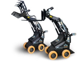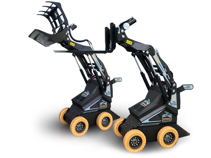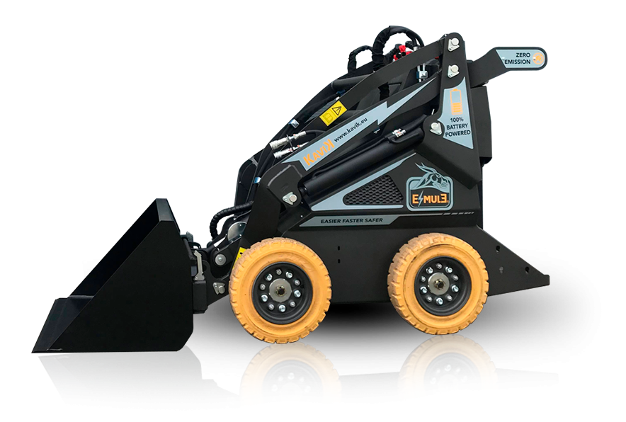 De emissievrije E-Mule is zeer krachtig in zijn categorie en ook polyvalent dankzij de beschikbare aanbouwdelen sloophamer, shovelbak, knijperbak, boor, borstel. Beschikt over een capaciteit van max. 7 werkuren voordat er weer stroom geladen moet worden. Beschikbaar als model op banden of rupsen.