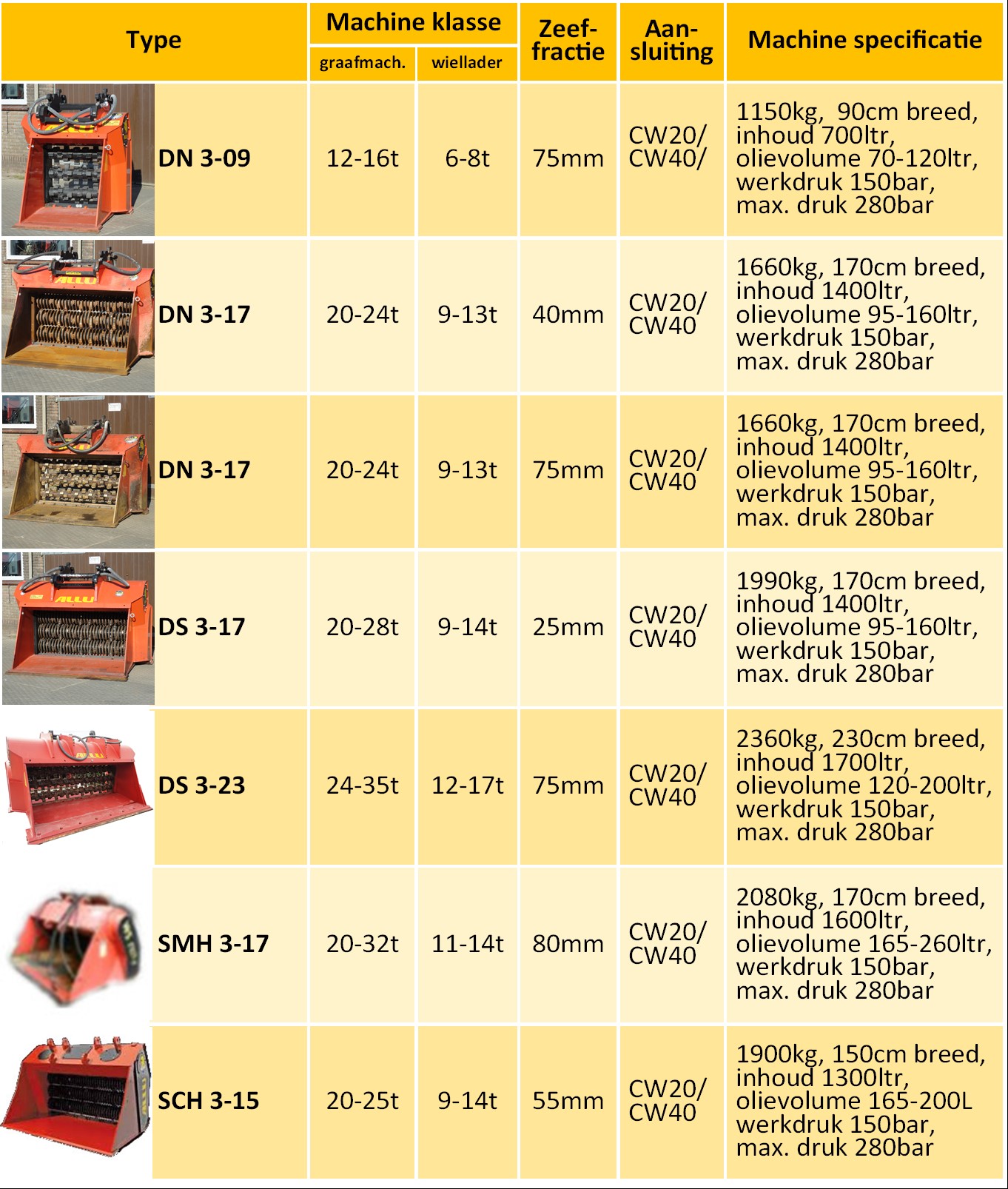 Verschillende zeefbakken in huur tbv graafmachines en wielladers met ophanging ;